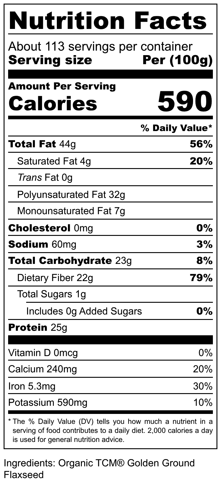 Ingredient: True Cold Milled Organic Golden Flax from whole organic flax seeds